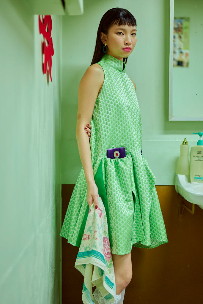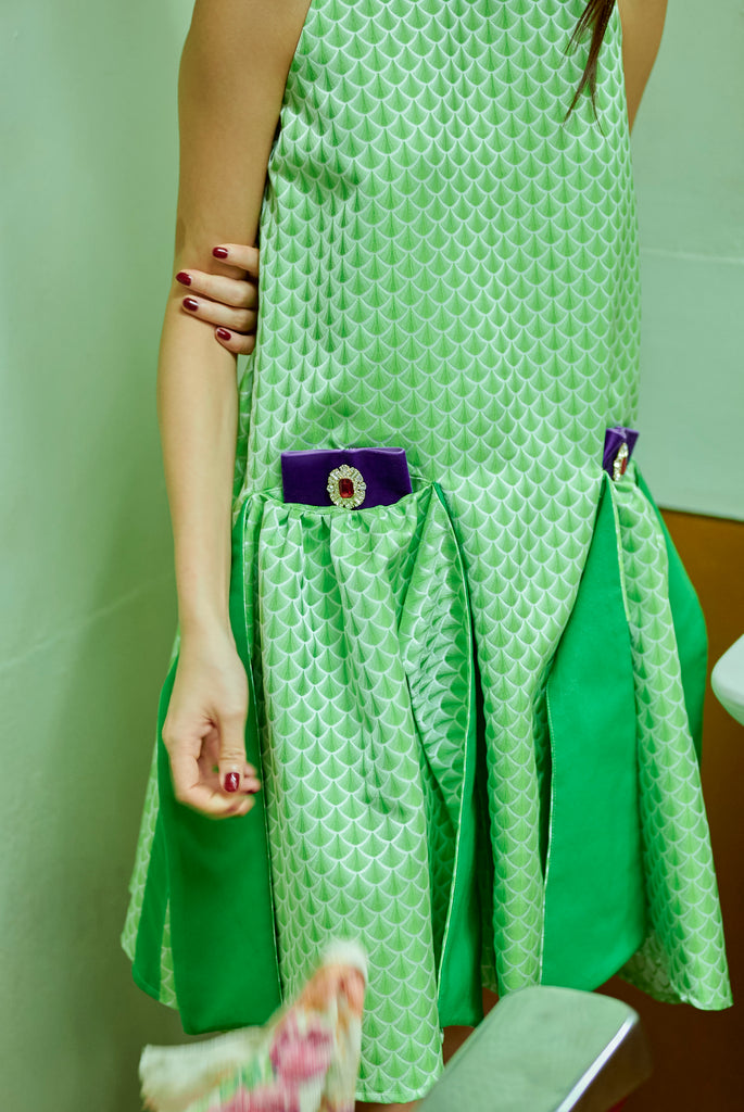 Sleeveless mandarin collar loose mini dress with front pocket detailing.
