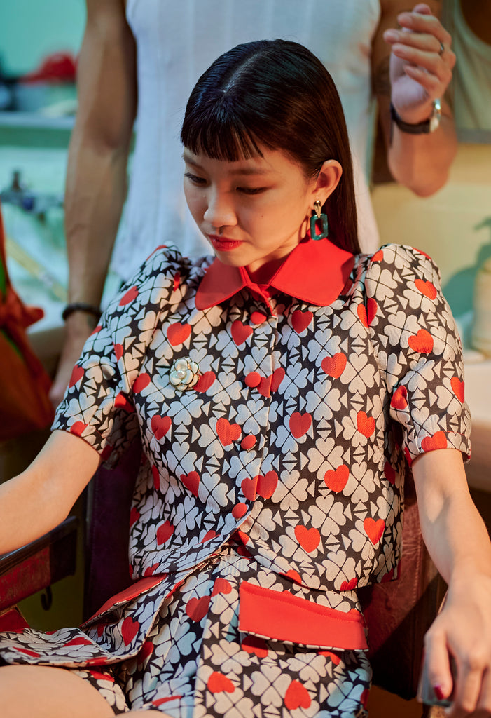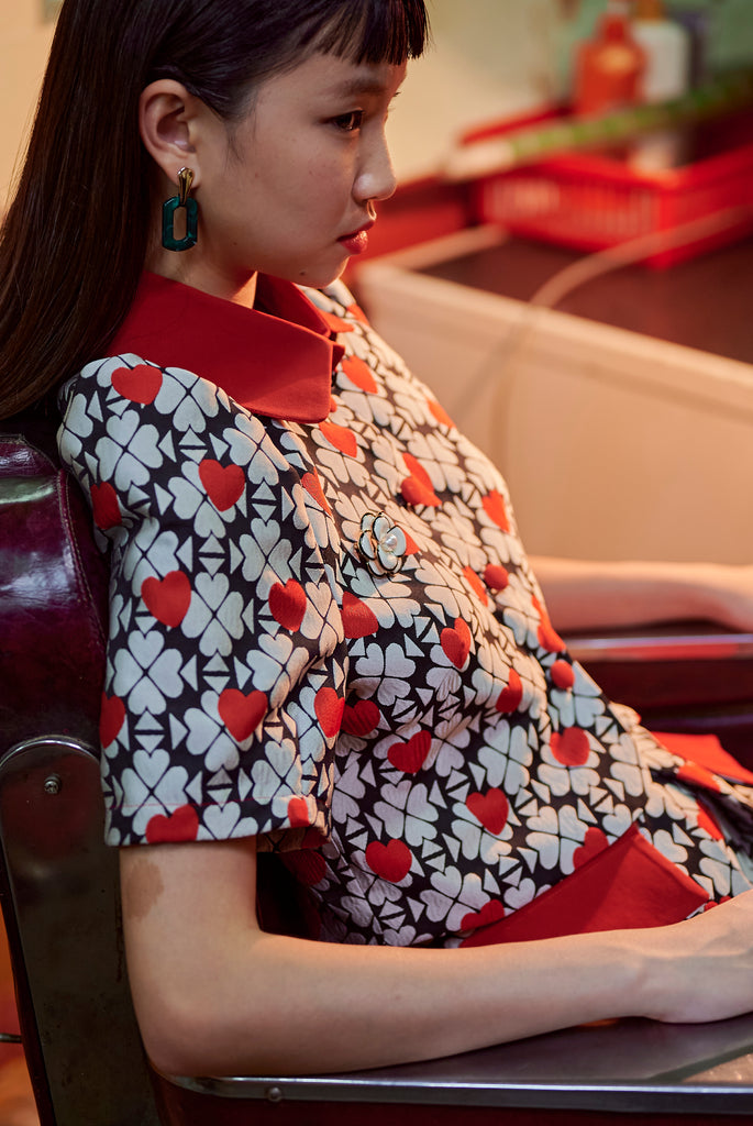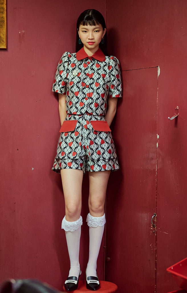 A black & red jacquard cut motif set, short sleeve crop jacket and shorts with front pocket and flap.