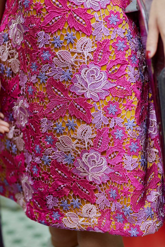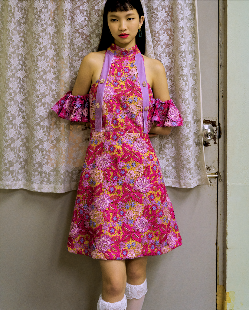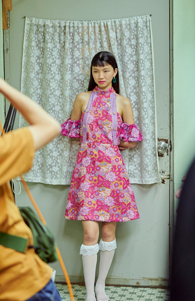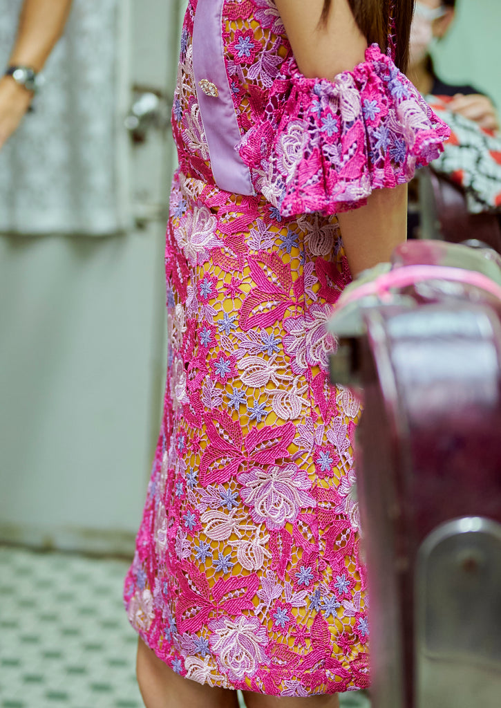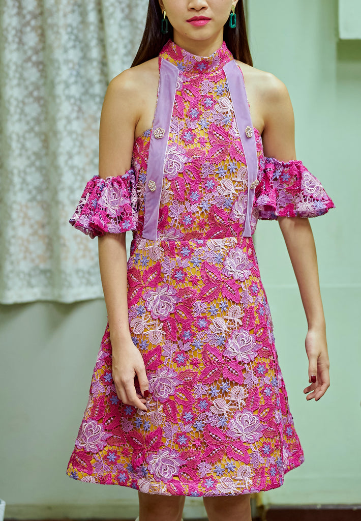 Magenta floral lace under layer with mustard yellow satin trimmings, halter neck short dress.