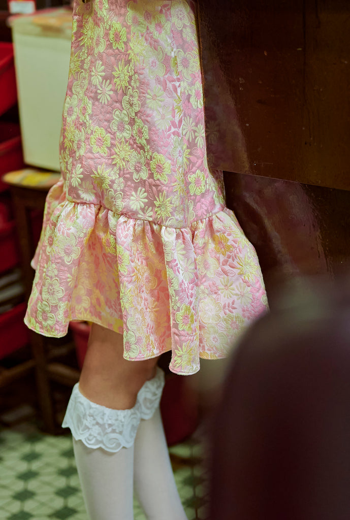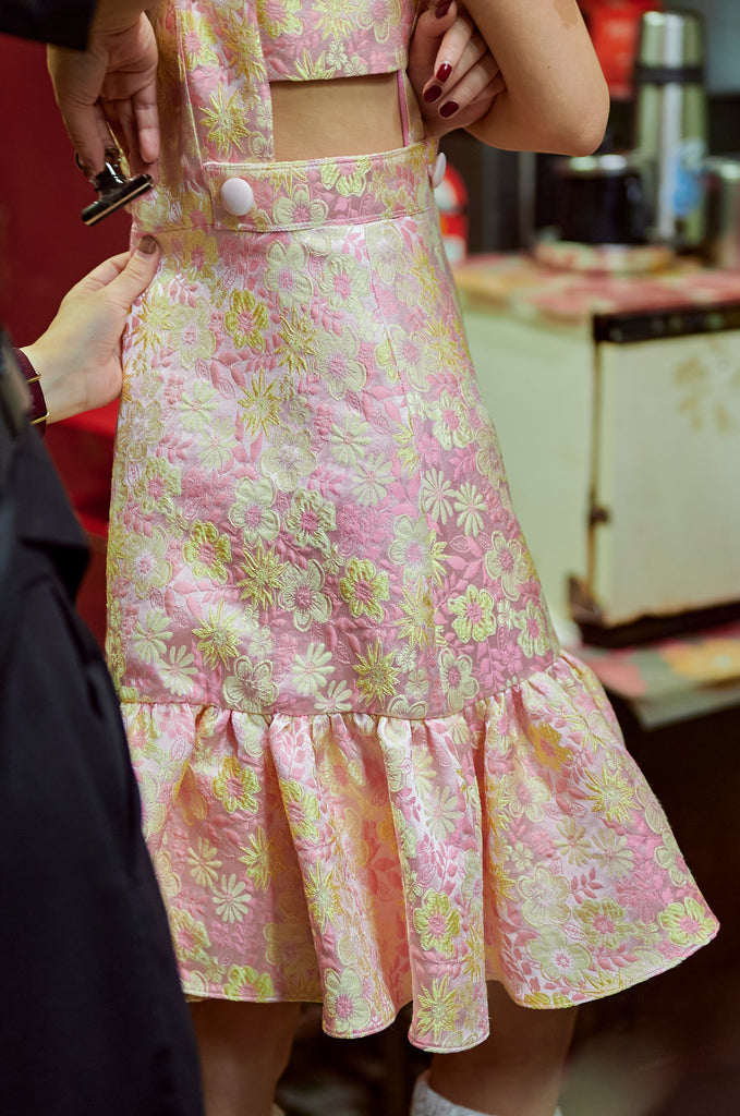 Pinkish yellow jacquard short dress with layered ruffles at the bottoms and ribbon panelling on the chest.