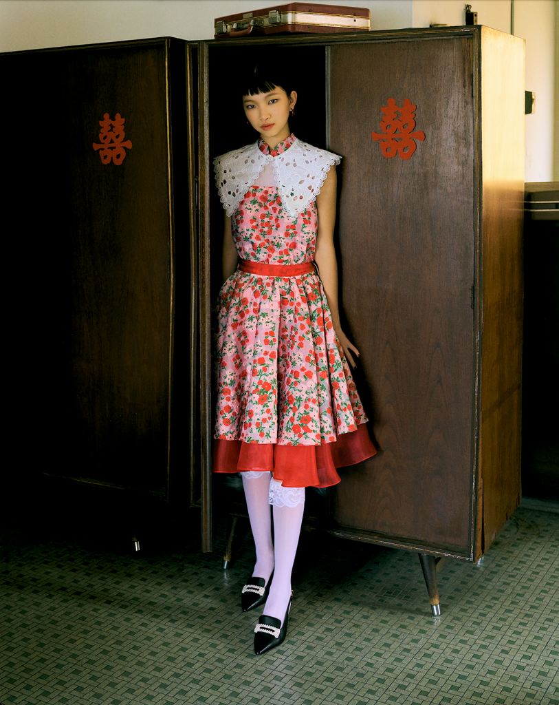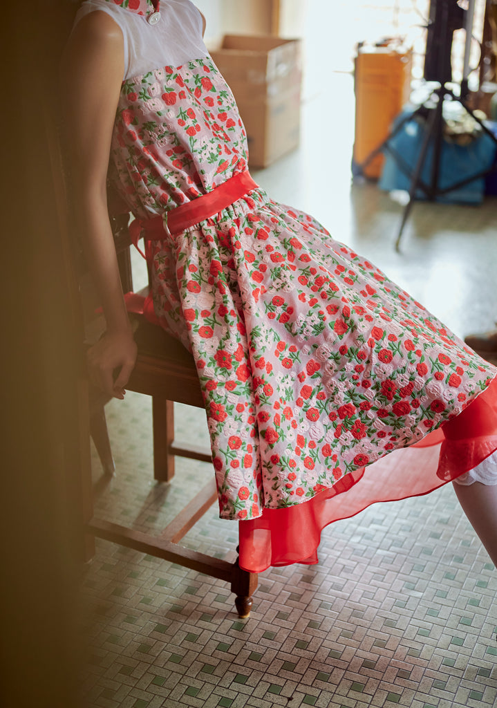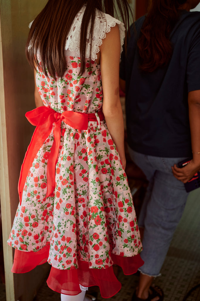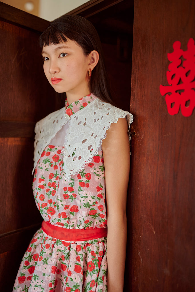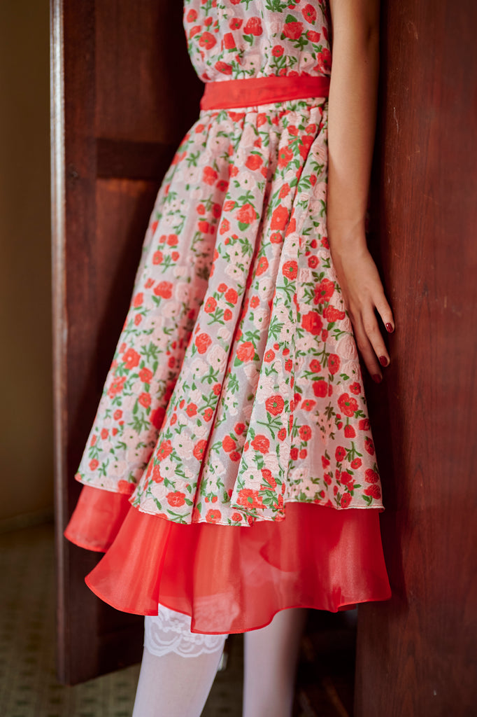 Mandarin collar, red & pink floral print layered with red organdy underlying hemline ruffles.